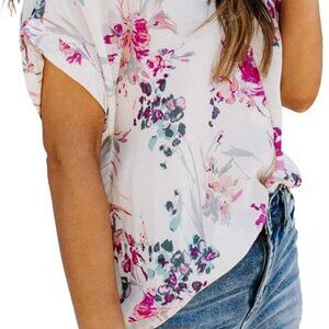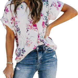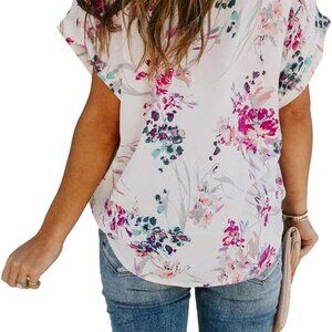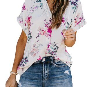 Women Summer Casual Split V Neckline Floral Chiffon Blouses Loose Tunic Short Sl