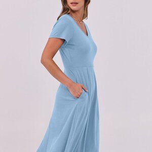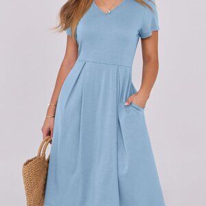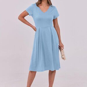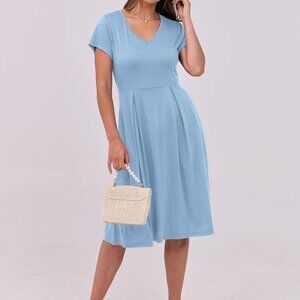 Women Summer Dress Casual Short Sleeve V Neck A-Line Knee Length Pleated Flowy 2
