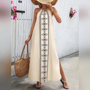 Women Summer High Slit Halter Backless Neck Tie Long Holiday Dress