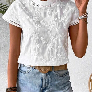 Women Summer Stand Collar Floral Jacquard Short Sleeve Loose Shirt