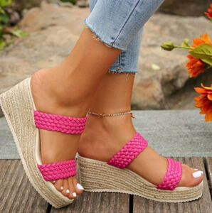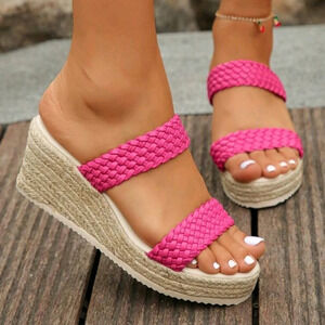 Women Summer Vacation Hot Pink Woven Wedge High Heel Platform Slides