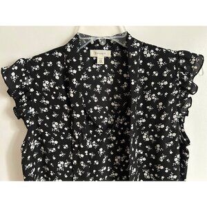 This charming blouse, crafted by Tamara H., features an elegant floral pattern in black and white, a tie neck design, and delicate ruffled sleeves. Made from 100% polyester, it offers comfort and style, making it an excellent choice for those who appreciate a blend of fashion and functionality. Its sleeveless design promises an airy fit, ideal for warmer weather or layered under a jacket.