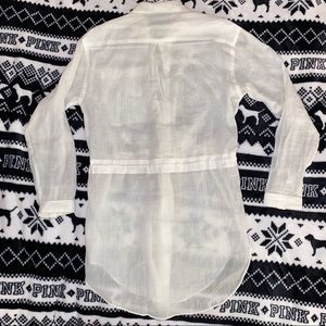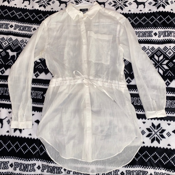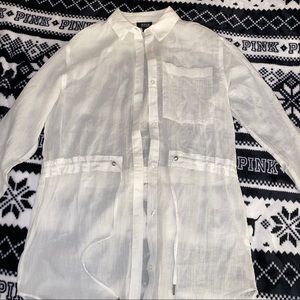 See through white button up long top.