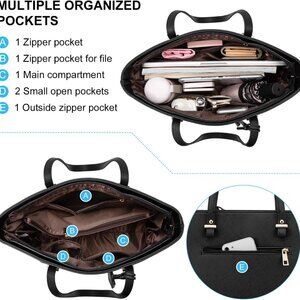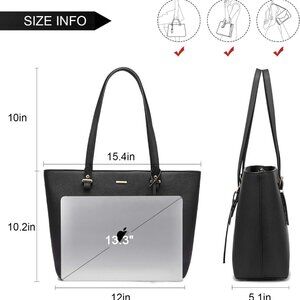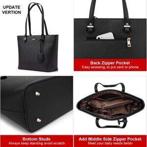 Features: This spacious faux leather tote has a classic look and a large main compartment that comfortably fits a 13" laptop — just right for work or errands. Includes 6 interior pockets to keep everything from your phone to keys organized, plus an external zipper pocket for quick access. Four metal feet help it stand upright when set down. Comes with a dustproof bag.