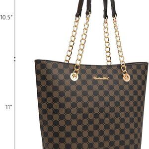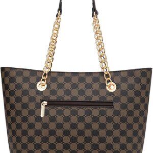 Features: Chic faux leather tote with a stylish golden chain handle, spacious design measuring 12 x 11 x 4.8 inches with a handle drop of 10.5 inches. It has a smooth zipper closure, strong stitching, and a leather lining. Great for carrying your iPad, magazines, keys, wallet, sunglasses, and lipstick—organized and chic.