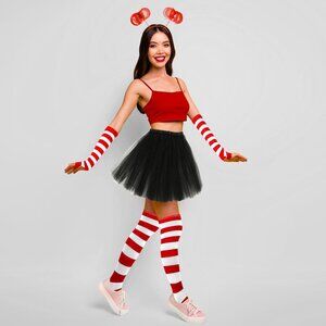 Features: This fun costume set includes a lightweight black tulle tutu skirt with an elastic waistband that stretches from 21.7 to 57 inches, so it fits most teens and adults comfortably. The skirt is 15.8 inches long and made of polyester, which means you can trim it for your perfect length. The package also comes with a playful red feather headband, a pair of red and white striped long arm warmer gloves, and matching striped socks — all stretchy, soft, and easy to wear for a variety of costumes or themed events.