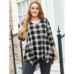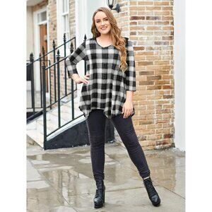 V Neck Plus Size Tops for Women - Plus size women's tunic tops 3/4 sleeve checkered shirt designed with irregular hem, v neck and classic buffalo plaid print. These plus size blouses for womens plaid shirt are perfect additions for your new season wardrobe.