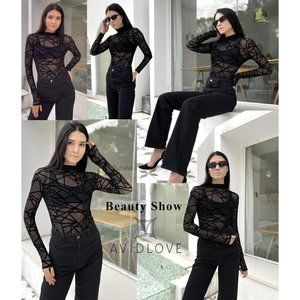 Snap Closure" bodysuit is convenient for you to put on and take off. Contrasts sheer mesh and geometric pattern of flocking improves fashion sense.