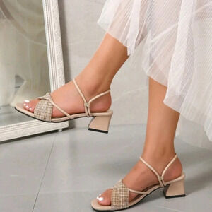 Women Twist Decor Chunky Heeled Slingback Sandals, Fabric Elegant Sandals