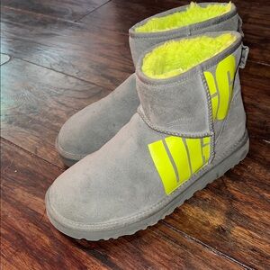 Women Uggs Boots Still In Good Condition Worn A Few Times Stylish gray boots with a vibrant lime Green accent. Perfect for a pop of color.