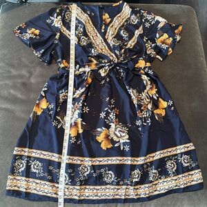 Women V-Neck Bohemian Navy Floral Print Short Summer Dress Cover Up Size XL NEW