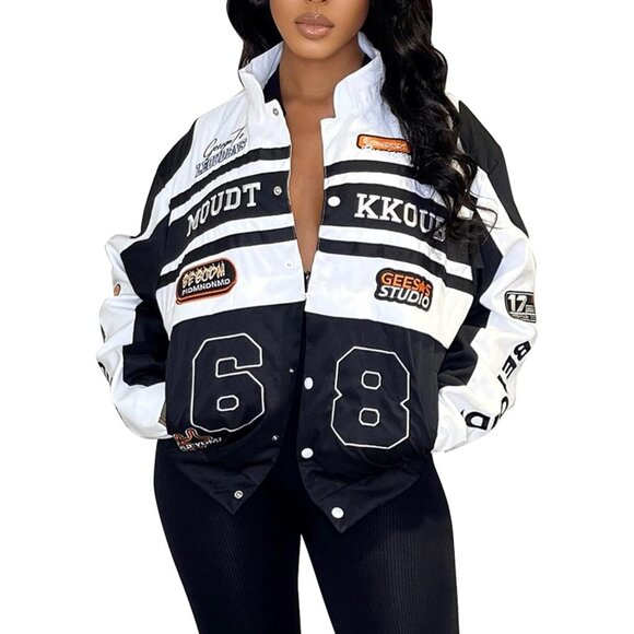 Women Varsity Jacket Motorcycle Racer Detachable Letter Graphic Jackets Black