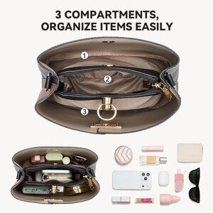 Women Vegan Leather Crossbody Bucket Bag Multi-Compartment Adjustable Strap
