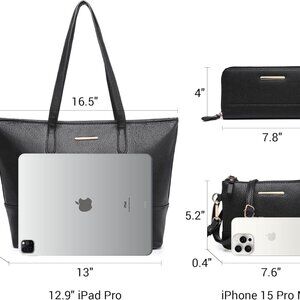 Features: Crafted from high-quality vegan leather with a soft cloth lining, this set includes a spacious tote, a sleek crossbody, and a handy wallet. The tote has a secure zipper closure, gold-tone hardware, and plenty of room for daily essentials like a tablet, notebook, or water bottle. The crossbody offers convenient hands-free wear, and the wallet has multiple card slots and a zipper pocket for extra organization.