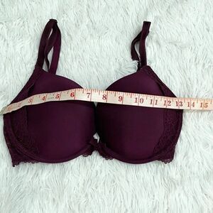 Women Victoria's Secret Underwired Lace Push Up Bra Size: 32DD Color: Dark Magenta Approximate lay flat measurement: Pit to pit: 14 inch Full length: 12 inch Fabric: 82% nylon 18% elastane Condition: EUC No stains/ holes/ defects Disclaimer: color may differ due to lighting