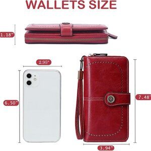 Features: Crafted from high-quality PU leather with a soft touch, this red wallet offers durability and a timeless style. It features 12 credit card slots, 2 cash compartments, an ID window, receipt slot, 2 phone slots, and a coin pocket. Includes a detachable wristband for versatile carrying, whether in hand or in a bag.