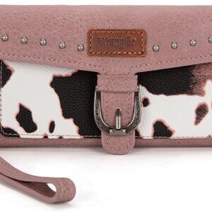 Features: Unique detachable design that easily switches between a tri-fold wallet and a bifold card holder, perfect for versatile use. Adorned with studded accents, a western buckle, and cow print for a standout look. Crafted from soft, premium vegan leather with a comfortable feel, built to last. Includes RFID blocking tech to keep your personal info safe. The lightweight wrist strap makes it super easy to carry on the go.