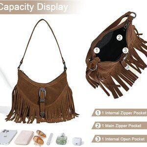 Product details Origin Imported Closure type Zipper About this item Material: The mini fringed crossbody bag is made with soft faux suede. It features antique black hardware and a stylish tassel design, adding a touch of vintage and boho flair to the overall look. Mini Size:10.6 x 2.4 x 7.5 inches . Adjustable shoulder strap can length up to 21.6 inches. The tassel shoulder purse is satisfy enough to fit your daily essential. Capacity: Small hobo bag has 1 main zipper pocket with 1 internal zipper pocket and 1 open slip pocket. Enough capacity to hold your daily