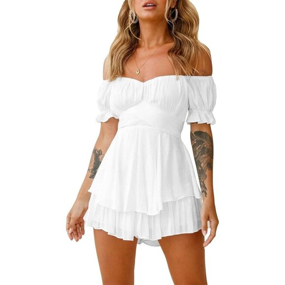 Women White Boho Romper Off Shoulder Ruffle Chiffon Shorts Jumpsuit Playsuits