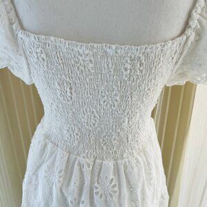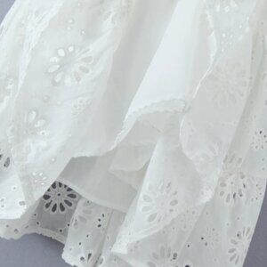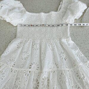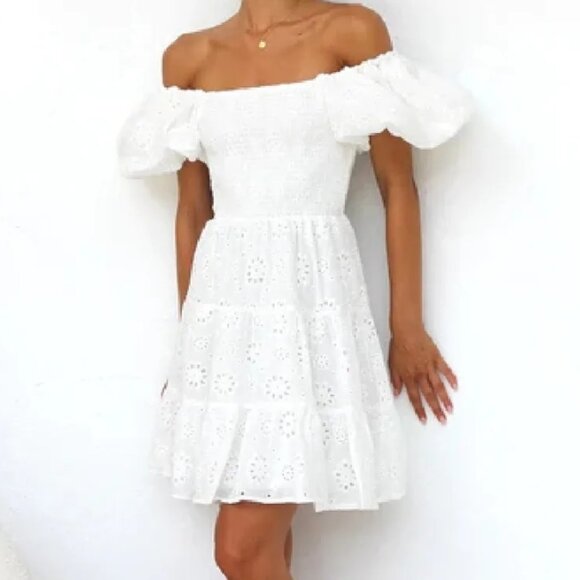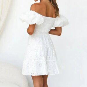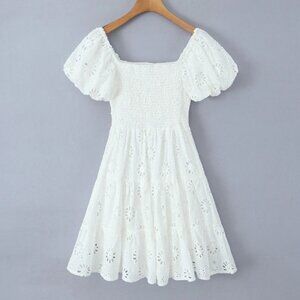 Women White Embroidery Hollow Out Hole Flower Short Puff Sleeve Mini Dress
