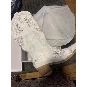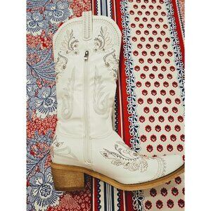 🆕Women White Faux Leather Knee High Sparkly Rhinestone Embroidered Boots