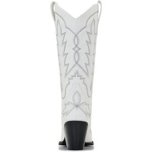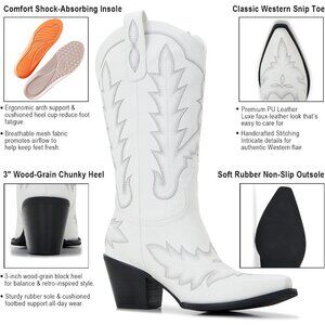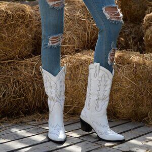 ⚡Women White Faux Leather Wood Grain Embroidered Chunky Heel Cowgirl Boots