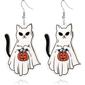 Women White Halloween Cute Ghost Pumpkin Cartoon Cat Spider Acrylic Fun Earrings