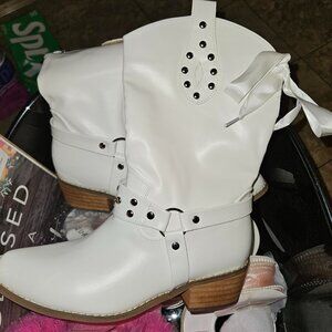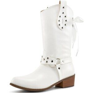 🆕Women White Leather Western Mid Calf Fashion Chunky Cowgirl Pointed Toe Boot
