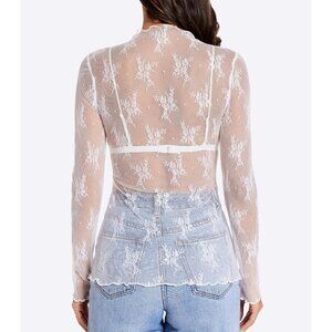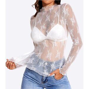 Women White Long Sleeve Mesh Top Mock Neck Sheer Blouse Lace Shirt Layering Top