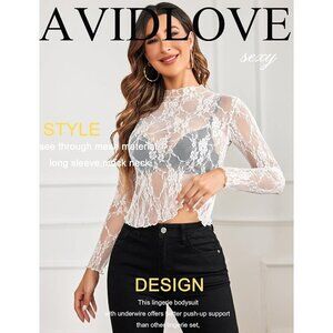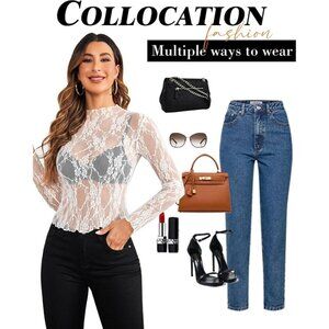 Women White Mesh Top Long Sleeve Mock Neck Sheer Blouse Floral Lace Tops