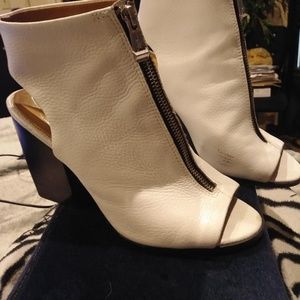 Lovely zip White Peeptoe Booties 71/2. Used. Still in great condition. As you can see in piks left has a scuff nothing a little white polish cant handle and right shoe has small chip big toe area. Other than that theyre totally Gorg! Heel Inch range 3 inch area. Happy Posh!