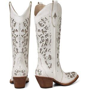 Women White Pointed Toe Pull On Rhinestones Chunky Heel Knee High Western Boots