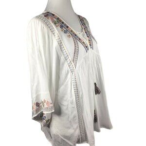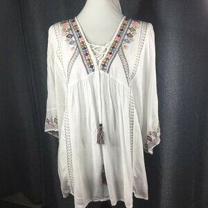 This boho top is perfect for flounce style featuring multi geometric embroidery and a relaxed fit.