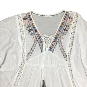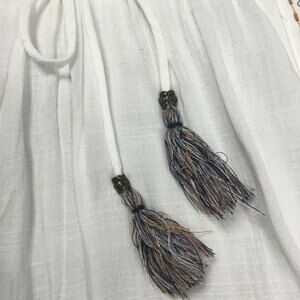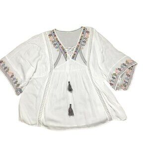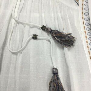 Women Whites Embroidered Multi Tassel Tie V-neckline Lace Up Peasant Top M