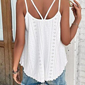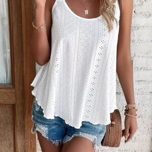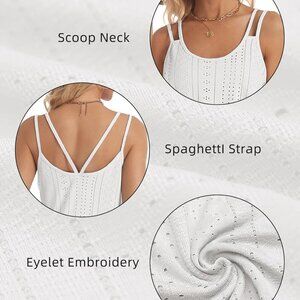 Features: Flowy sleeveless tank top with eyelet embroidery spaghetti straps and a relaxed fit that’s perfect for hot days. Soft, breathable fabric with a touch of stretch, making it super comfy for casual outings or beach days.