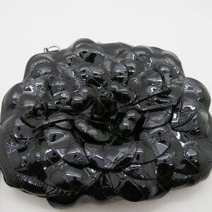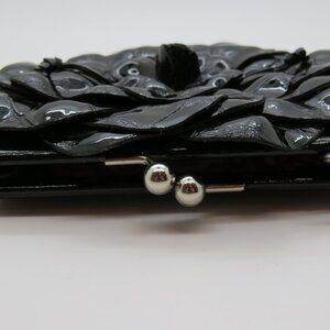 Women Brighton Small Black Patent Leather Kisslock Wallet Coin Purse Handheld Wristlet. Shiny patent leather rose petal pattern adorns the front. Patent leather has a slight sticky feel. Colorful floral cloth lined interior with ID card slots. Silver kisslock open and close smoothly. Removable wristlet strap for handheld. Petite and just the perfect size, if you don’t mind a slight sticky feel.