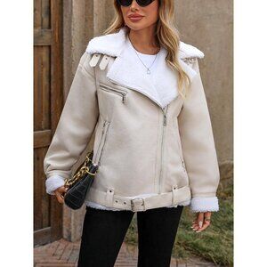 Design: Soft lamb touch faux leather jacket with Sherpa lined collar,center front zipper closure,plush sherpa lining and trim details on collar, cuffs and hem. two lower real pockets,chest pockets and side zipper for decoration