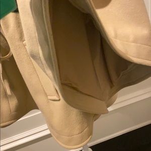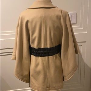 Dinner woman coat with wide sleeves one size fits all elastic bands inside that allow to tighten or stretch to fit anywhere from a size 4/6 to a 8/10 or 12 US size! Camel color leather waste detail and strings in the front to tie ! Loose style ! Wool material very good condition gently worn!
