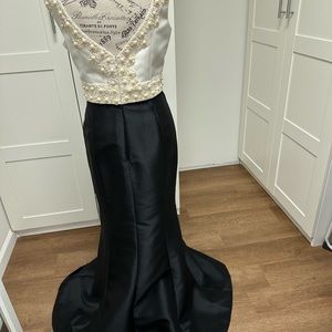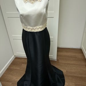 This is new evening maxi dress of white/black colors ( white top and black skirt) by Kay Unger.