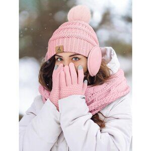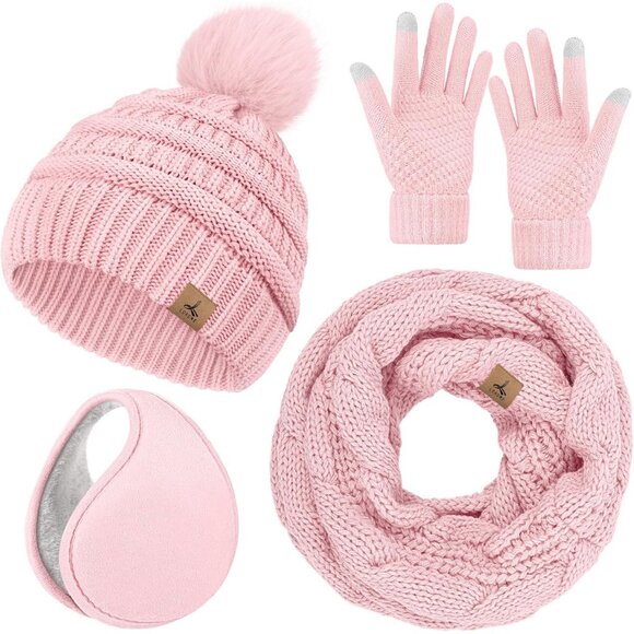 Women pink Knit Beanie Hat, Gloves, Scarf & Ear Warmer Set - Winter