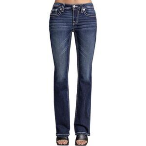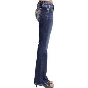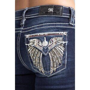 Features: These jeans feature embroidery of metallic sequins forming a wings design in bronze, gold, and silver tones, plus stitched leather appliqué highlights and rhinestone rivet details. The mid-rise waist and bootcut fit create a flattering silhouette, perfect for elevating any outfit.