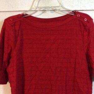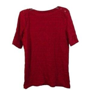 This women's top features a sophisticated red hue with button details on the shoulders, offering a polished look for professional settings.