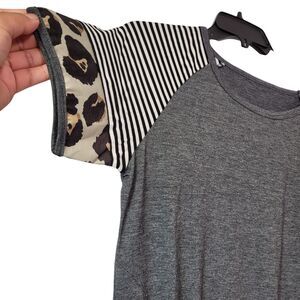 This Women's Summer Twist Knot T-Shirt Dress in Gray is a casual and stylish choice for the warmer months. The short sleeve design and twist knot detail add a trendy touch to the classic crew neck silhouette. The leopard print sleeve stripe adds a playful accent, making it ideal for a casual summer occasion.