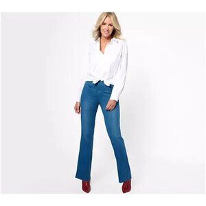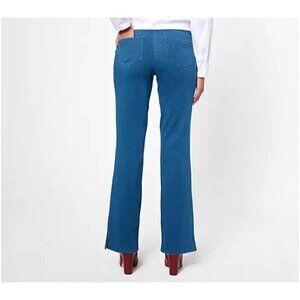 Fabrication: Elite Prime Stretch DenimFeatures: crossover waistband with Tummy Control lined with Blu-Tech Control SystemTM mesh for smoothing and support without the need for a shaper or compression garment; embroidered back pocketsRise: slightly below the waistFit: semi-fitted; follows the lines of the body with added wearing easeLeg Shape: petite flare; flares slightly from knee to leg openingInseam: missy/plus inseam 32"Content: body 56% cotton/29% Repreve recycled polyester/15% spandex, exclusive of decoration; lining 84% nylon/16% spandexCare: machine wash cold, tumble dry lowImported