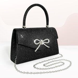 Features: This fabulous black evening clutch features a gorgeous double bow embellished with shiny rhinestones, adding an elegant touch to your outfit. Compact size at 9" x 2.4" x 5.1" with a lightweight feel, perfect to carry essentials like your phone, lipstick, and tissues. The sturdy magnetic flap keeps everything secure, and the frosted sheen makes it irresistibly charming. Comes with a detachable chain strap, so you can wear it as a crossbody or shoulder bag—ideal for formal events or casual nights out. Stylish and versatile, it’s a great gift for your favorite lady.