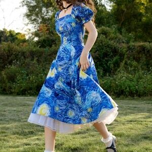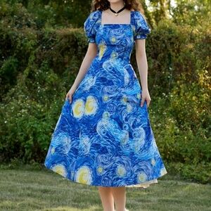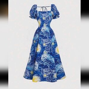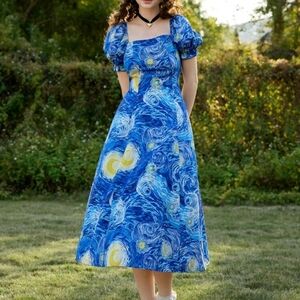 WomenVan Gogh"Starry Night"Print Dress,Retro Palace Style Puff Sleeve,Art Series
