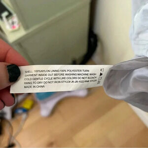 GUC--One pull in the hood. There are some loose threads on the back bottom cords. There is also some scratching to the all buttons on the front pockets. See photos of all flaws.