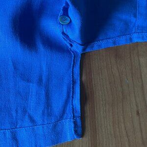 This lilac-colored, 100% linen, women's pullover, 3/4 sleeve top is in great shape. The front placket is accented with ten abalone buttons. Not sure if its hip length qualifies it being considered to be a tunic; I usually think of tunics as being a bit longer. Nice drape. Flattering side slits. Extra button is on the inside. The color is slightly lighter than represented in the photos. I used the purple and pink color tags because "lilac" was not an option. Preshrunk. Hand or machine wash in cold water with mild detergent. Though the size is indicated to be "small," it has a roomy, boxy fit. Check the measurements.