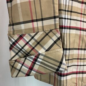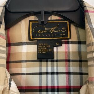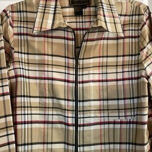 Made you look! This is a women’s vintage 100% silk Dian Gemar shacket. (Not Burberry!☹️) Zipper front closure. Front left breast pocket. Roll up sleeves for a perfect adjustable fit. White, tan, red and black plaid pattern that looks a LOT like the classic Burberry Nova pattern. Quality is very similar to that more expensive brand, too! Excellent vintage condition with no rips or stains. Women’s size medium.