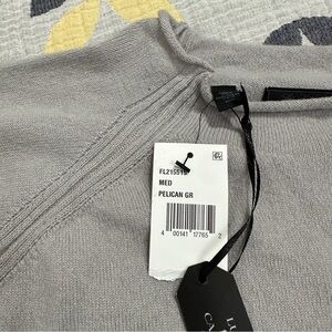 Saks Fifth Avenue 100% cashmere pelican gray funnel neck sweater, new with tags. Size medium. Angled shoulder seaming, rib knit cuffs. 2" longer in back than front.